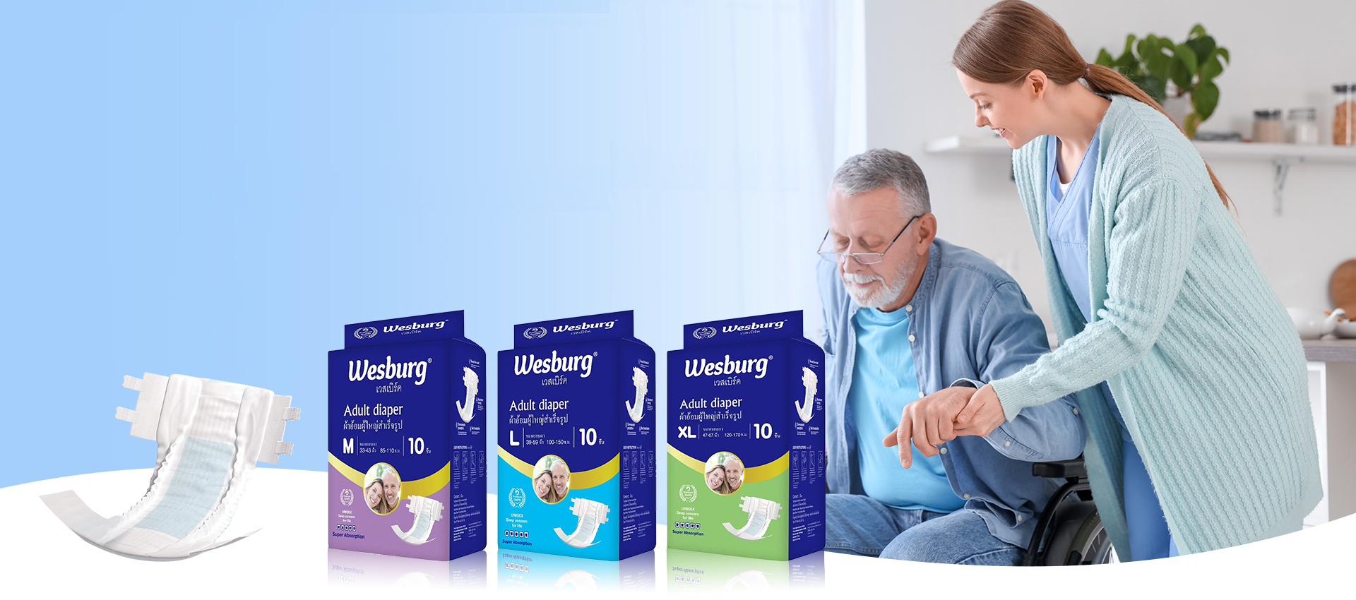 2Wesburg-การดูแล นำเสนอผลิตภัณฑ์ที่แตกต่างสำหรับผู้สูงอายุที่มีระดับการเคลื่อนไหวที่แตกต่างกัน แนะนำผ้าอ้อมผู้ใหญ่แบบสแน็ปอินการดูดซึมสูงที่สะดวกสำหรับผู้ดูแลในการเปลี่ยน